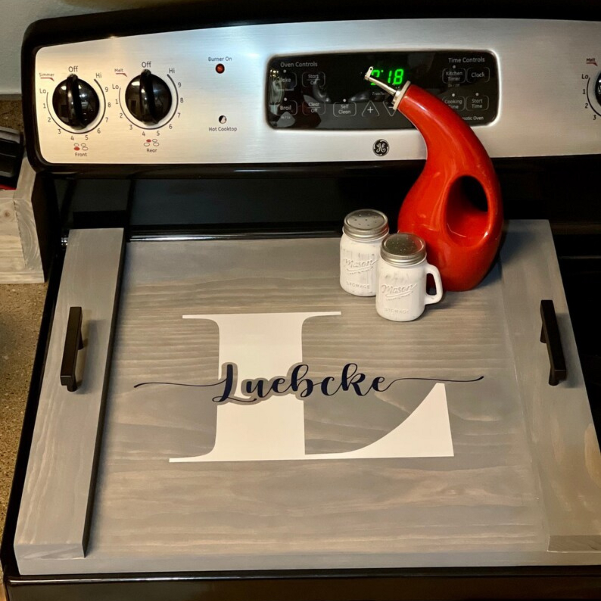 Custom handmade kitchen stove top cover | noodle board. Every piece is hand crafted and stained by hand to ensure a unique work of art. Custom designed personalization is also available using vinyl in the color of your choice (seen above in the pictures).