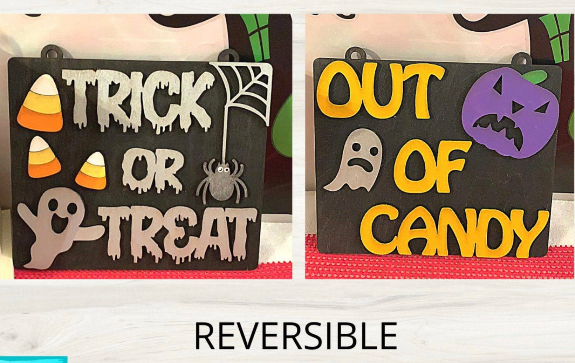 If you love the Halloween season & handing out candy on Halloween then you will love this Reversible Halloween Candy Sign to let all of the Trick or Treaters when you are out of candy. Hang it on your door with the Trick or Treat facing out when you are home & available to hand out candy. When you run out of candy just flip it over to show "Out of Candy". And we are happy to paint the signs the colors of your choosing.